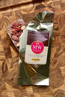 Handcrafted milk chocolate bar with pieces of freeze dried strawberries & assorted nuts.