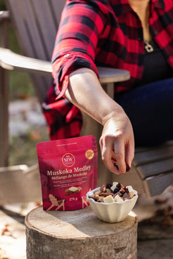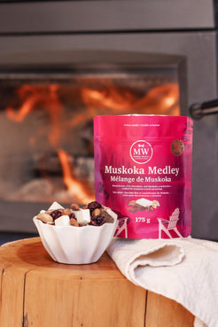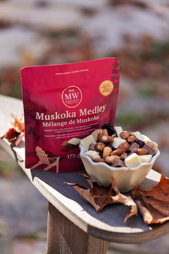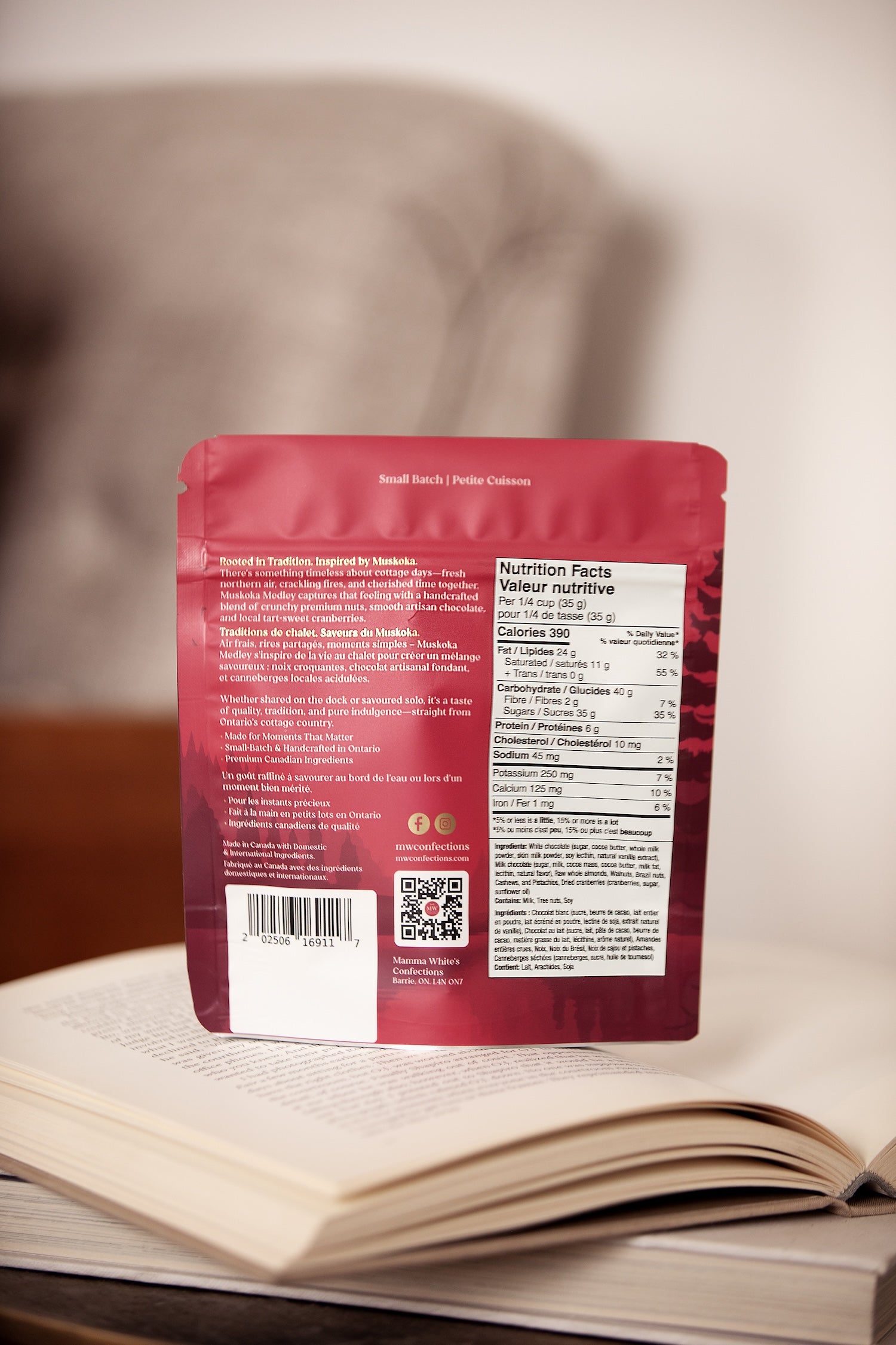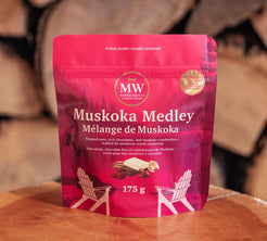 A delightful blend of crunchy assorted nuts, tart Muskoka cranberries, and smooth squares of milk and white chocolate. This harmonious mix offers the perfect balance of sweet, tangy, and nutty flavors — an irresistible treat for snacking, gifting, or sharing.